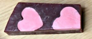 A beautiful rose scented pink massage bar covered in valentine hearts.