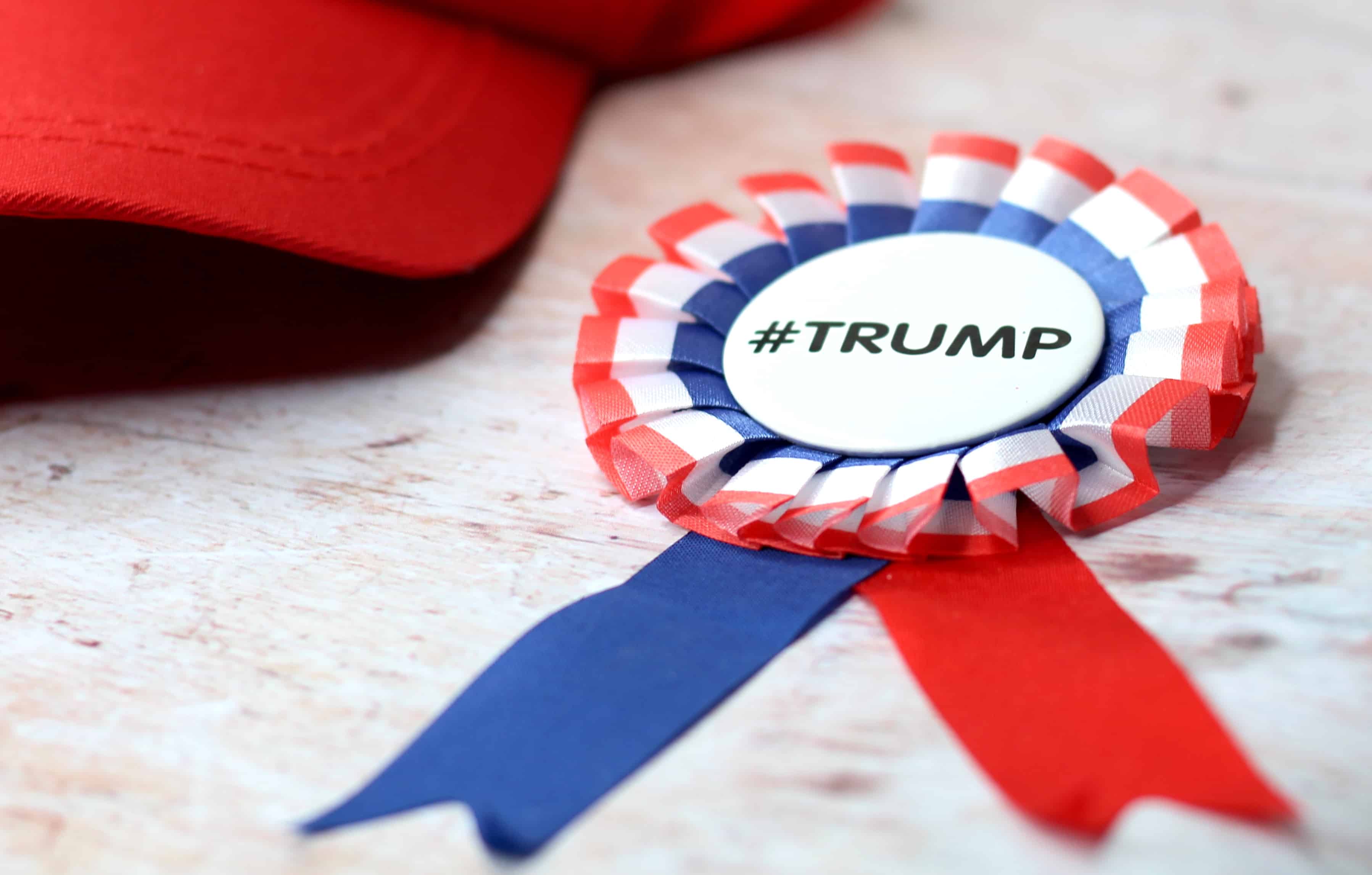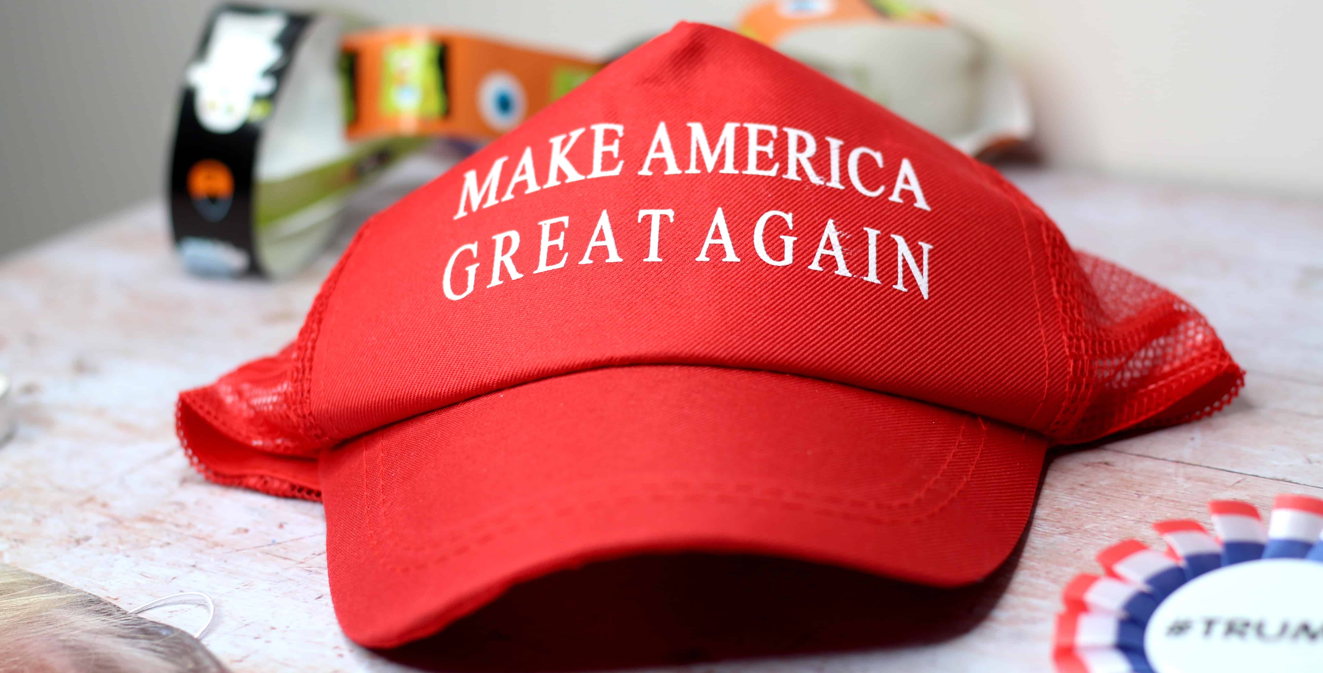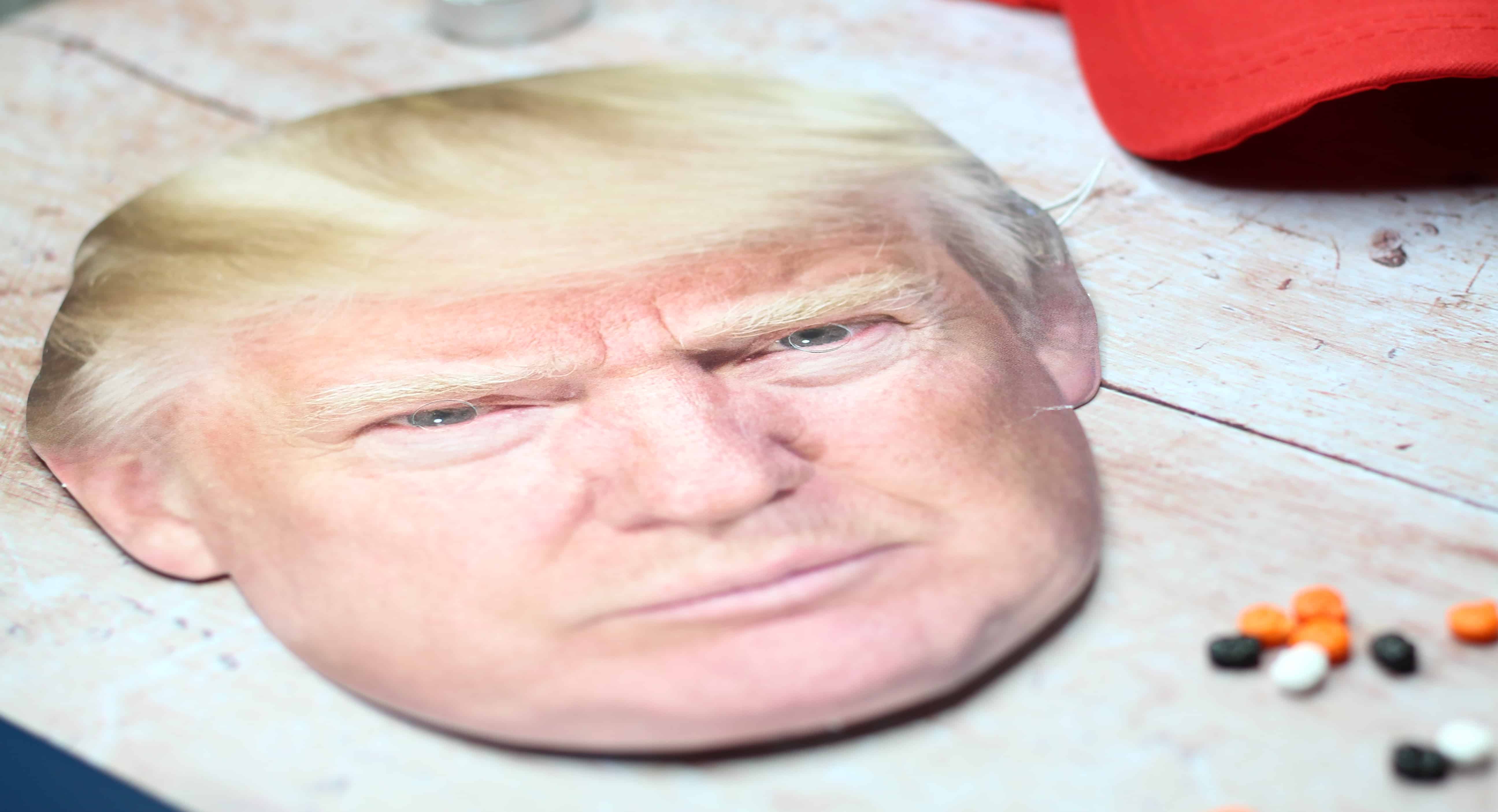 The range includes the iconic red tie, selfie props, American flags, head boppers, golf balls, a Trump supporter rosette, Trump bobble head, “Make America Great Again’ red baseball cap and a Donald Trump cut out mask!