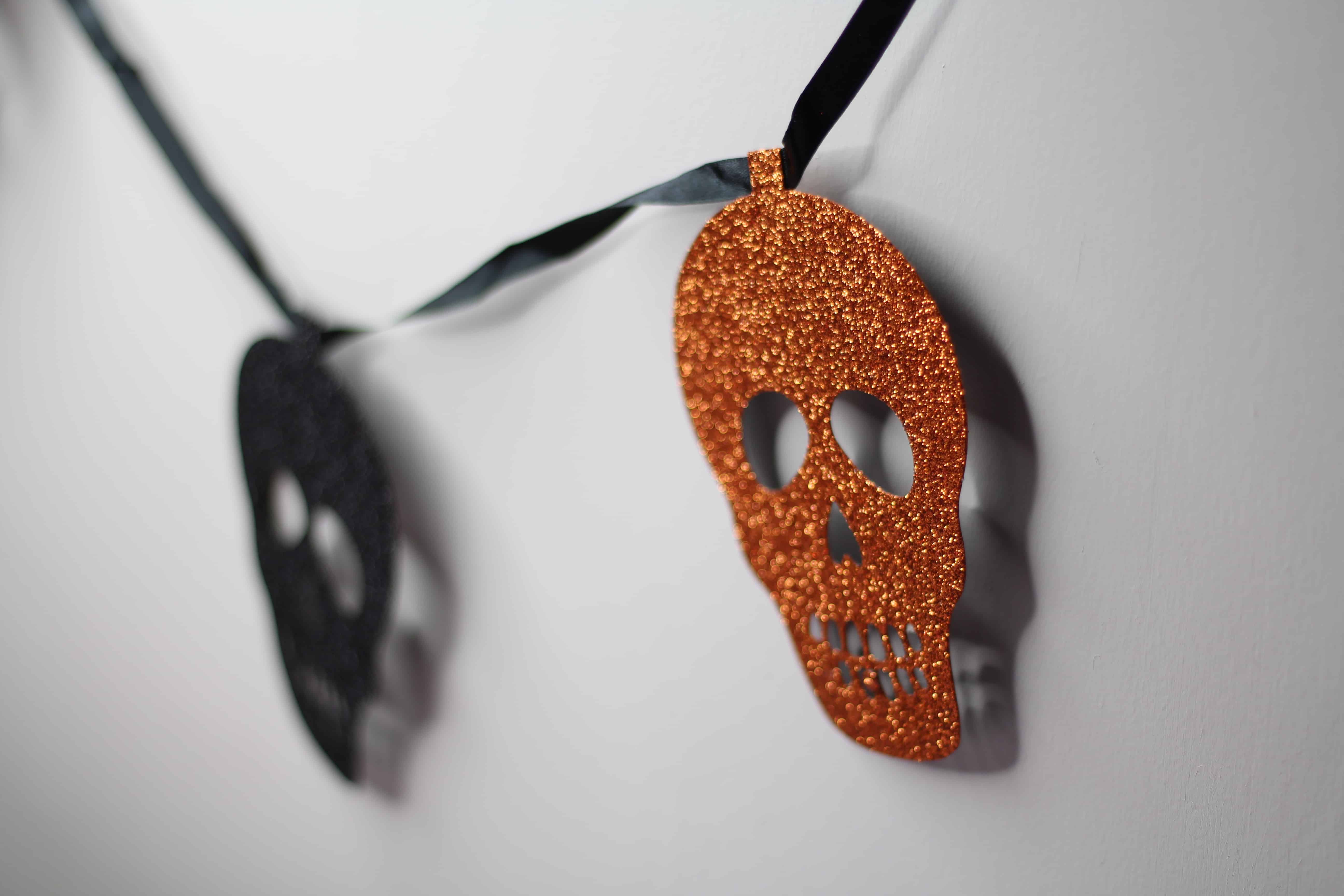 Black and orange glitter skulls make this bunting sure to stand out at any Halloween party! Each skull is attached to a thick black ribbon which makes hanging the bunting easy.