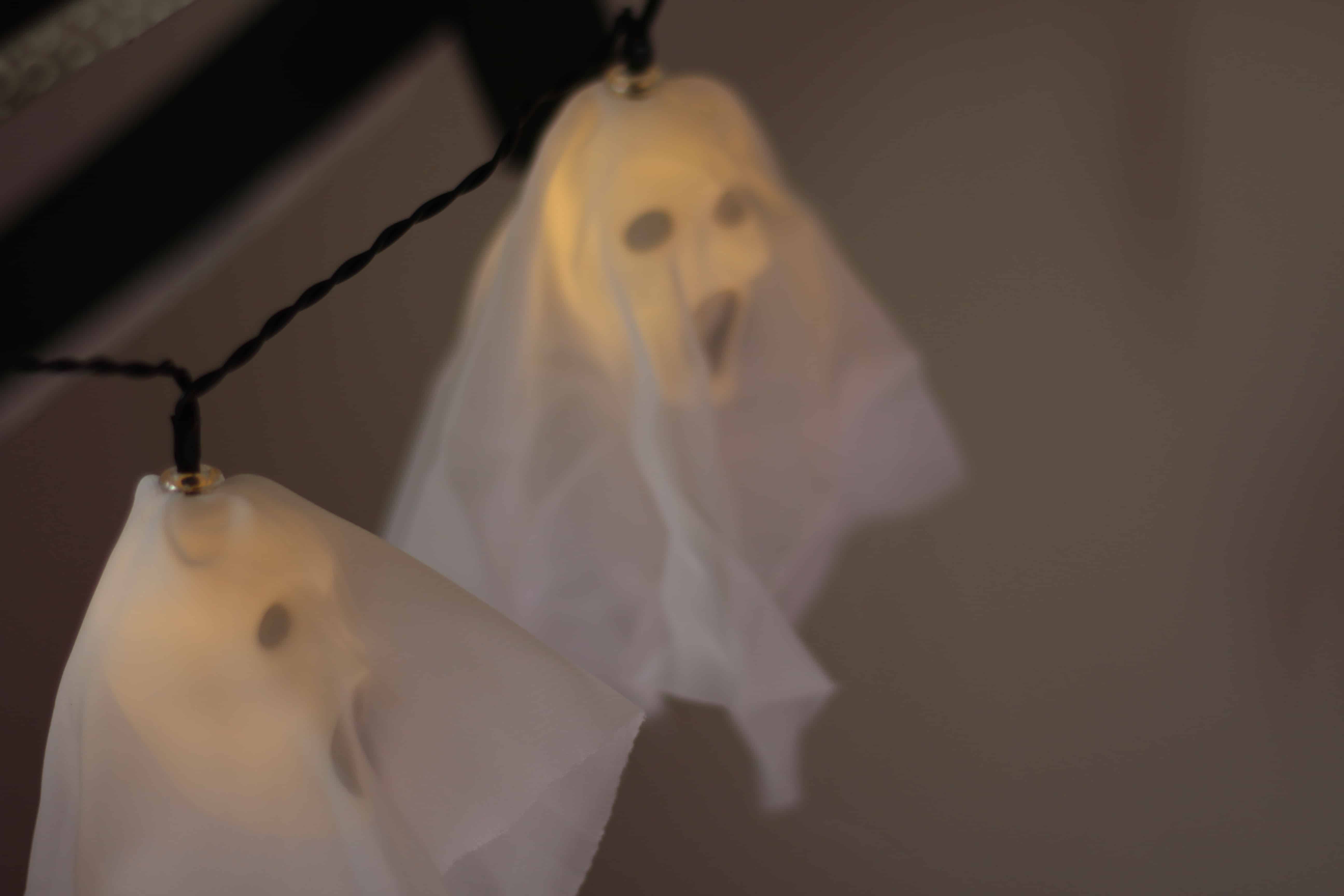 These ghost string lights are a spooky addition to any Halloween decoration! They light up with a warm white light using energy saving LED’s!