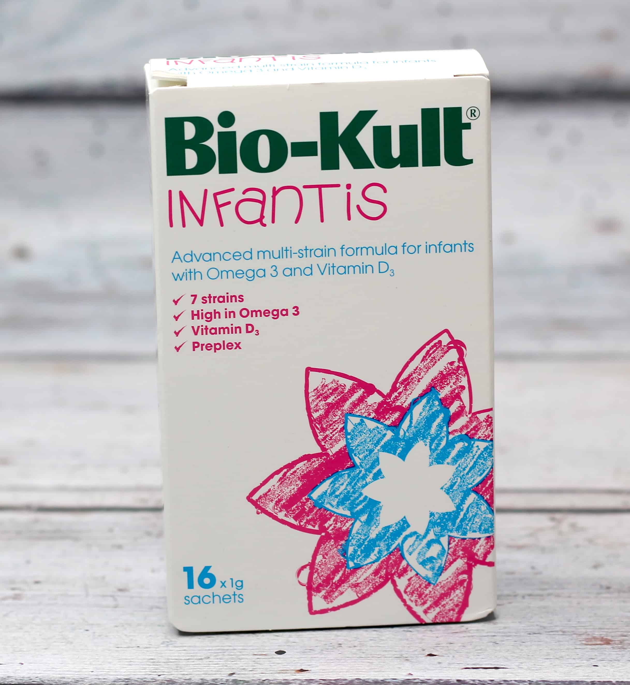 Bio-Kult Infantis comes in a sachet form that you mix with water, milk or food. Each sachet contains a minimum of 1 billion microorganisms all of which are balanced throughout the shelf life of the product! Bio-Kult Infantis is also high in Omega-3 and Vitamin D3 but also contains 7 strains of live probiotic bacteria and the prebiotic Preplex designed to aid a balanced gut.