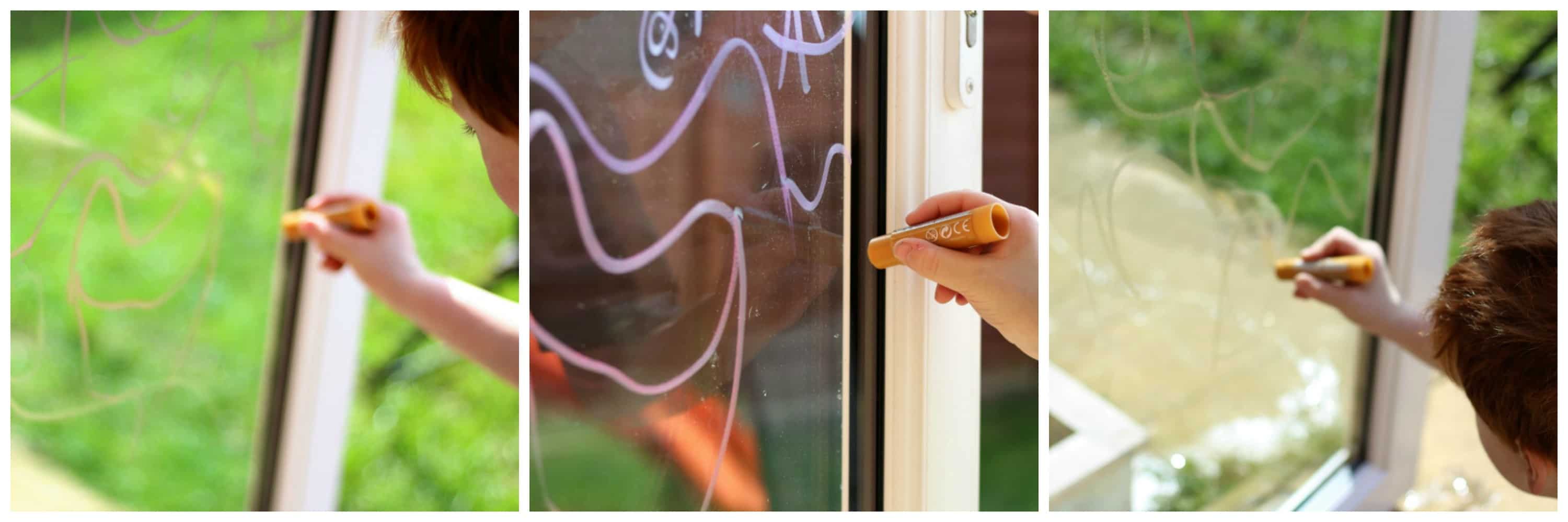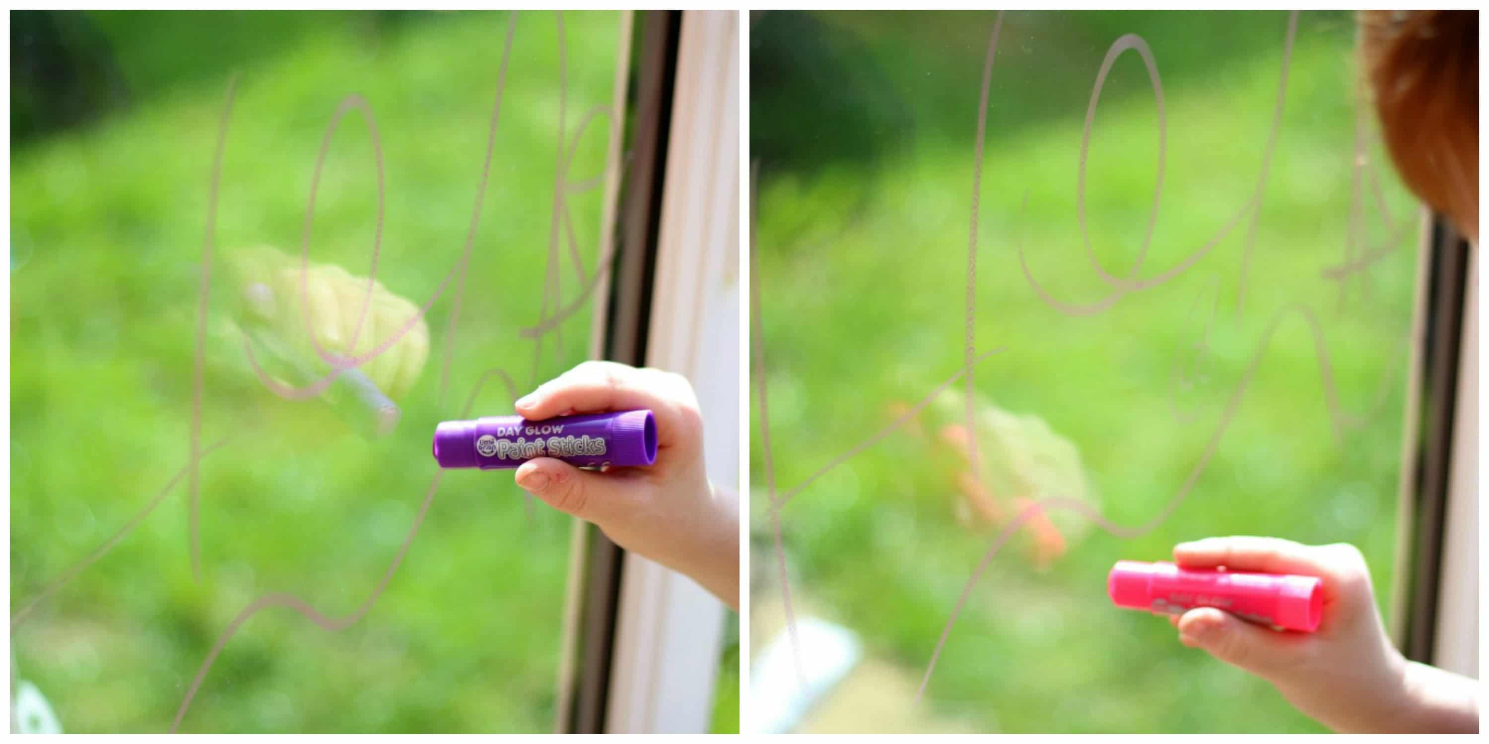 One cool thing about the paint sticks is that they paint on most surfaces easily. This includes paper, card, wood and even glass. Henry had a little go painting on the French doors and he had such fun and it is so easy to wipe away when hes done! This will be a great Summer time activity for him!